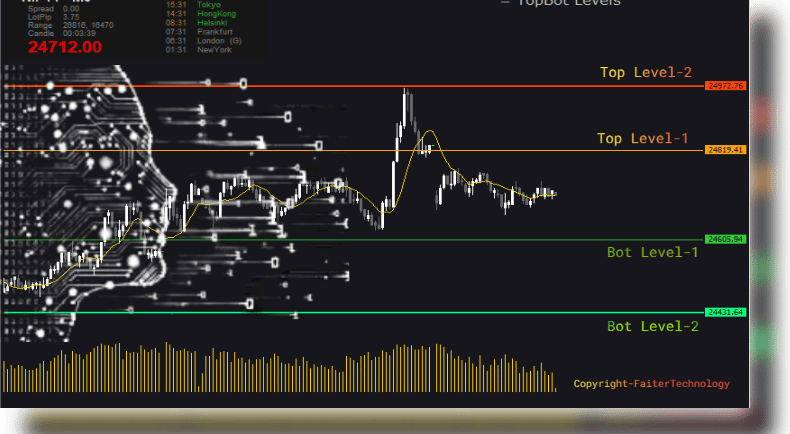 In today's fast-moving financial markets, traders face an overwhelming flood of information. Knowing where price is likely to reverse, stall, or accelerate is the difference between a disciplined trade and a costly mistake. TopBot Levels is a precision trading tool built by Faiter Technology that answers this question with mathematical clarity — defining the outer boundaries of normal price movement for any instrument, on any timeframe.